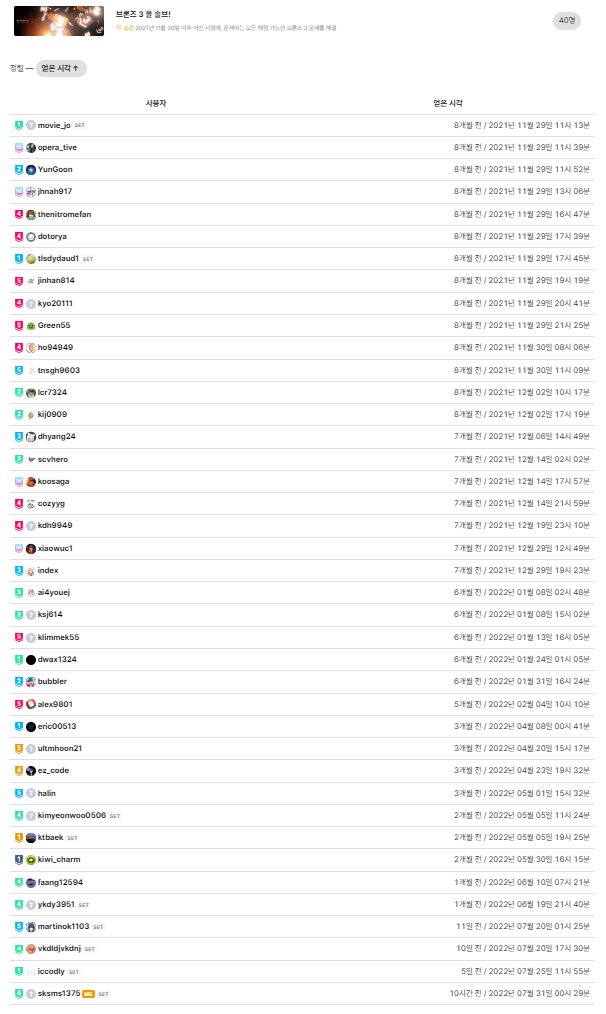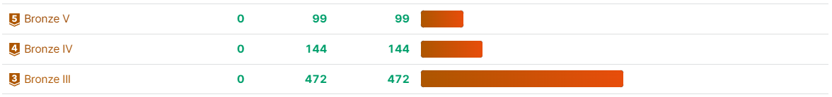 22년 7월 31일 00시 29분에 브론즈 3을 올솔하면서 브5, 브4, 브3을 모두 올솔했다.
